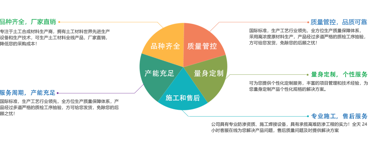 公司所有產(chǎn)品均采用國(guó)際標(biāo)準(zhǔn)組織生產(chǎn),并經(jīng)國(guó)家、市技術(shù)監(jiān)督局采標(biāo)驗(yàn)收,生產(chǎn)工藝及水平全國(guó)領(lǐng)先,屬國(guó)內(nèi)優(yōu)等水平,實(shí)物質(zhì)量達(dá)到國(guó)際先進(jìn)水平。經(jīng)用戶、施工單位使用證明,質(zhì)量穩(wěn)定可靠、施工方便、價(jià)格合理、售后服務(wù)完善。產(chǎn)品主要應(yīng)用于農(nóng)業(yè)、海綿城市建設(shè)、公路、鐵路、垃圾填埋場(chǎng)防滲,水利、電力、水土保持及環(huán)境綠化與基礎(chǔ)建設(shè)領(lǐng)域,已被廣泛應(yīng)用于高速公路、鐵路、垃圾填埋場(chǎng)等多項(xiàng)國(guó)家重點(diǎn)工程,受到工程界專(zhuān)家及廣大用戶的一致好評(píng)。